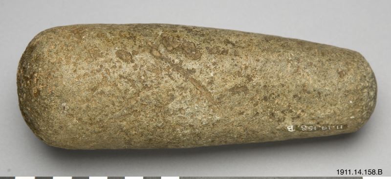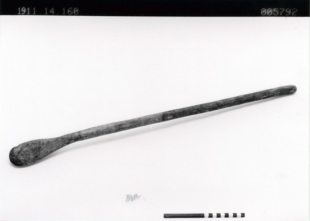 Den ser ut som en spade med kraftigt skaft och litet9;rundat blad. Användes för att röra om med vid kokning med heta stenar i korg. Längd: 91.7 cm. [ocr]